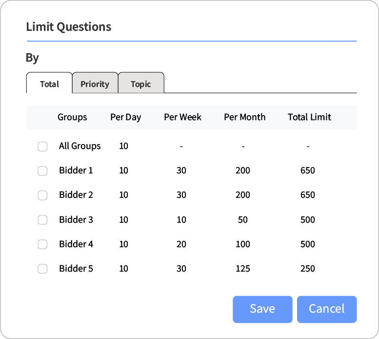 Keep the process manageable by limiting the number of questions that can be raised on a daily, weekly or lifetime basis, as well as by topic. Apply different limit settings for different bidder groups.