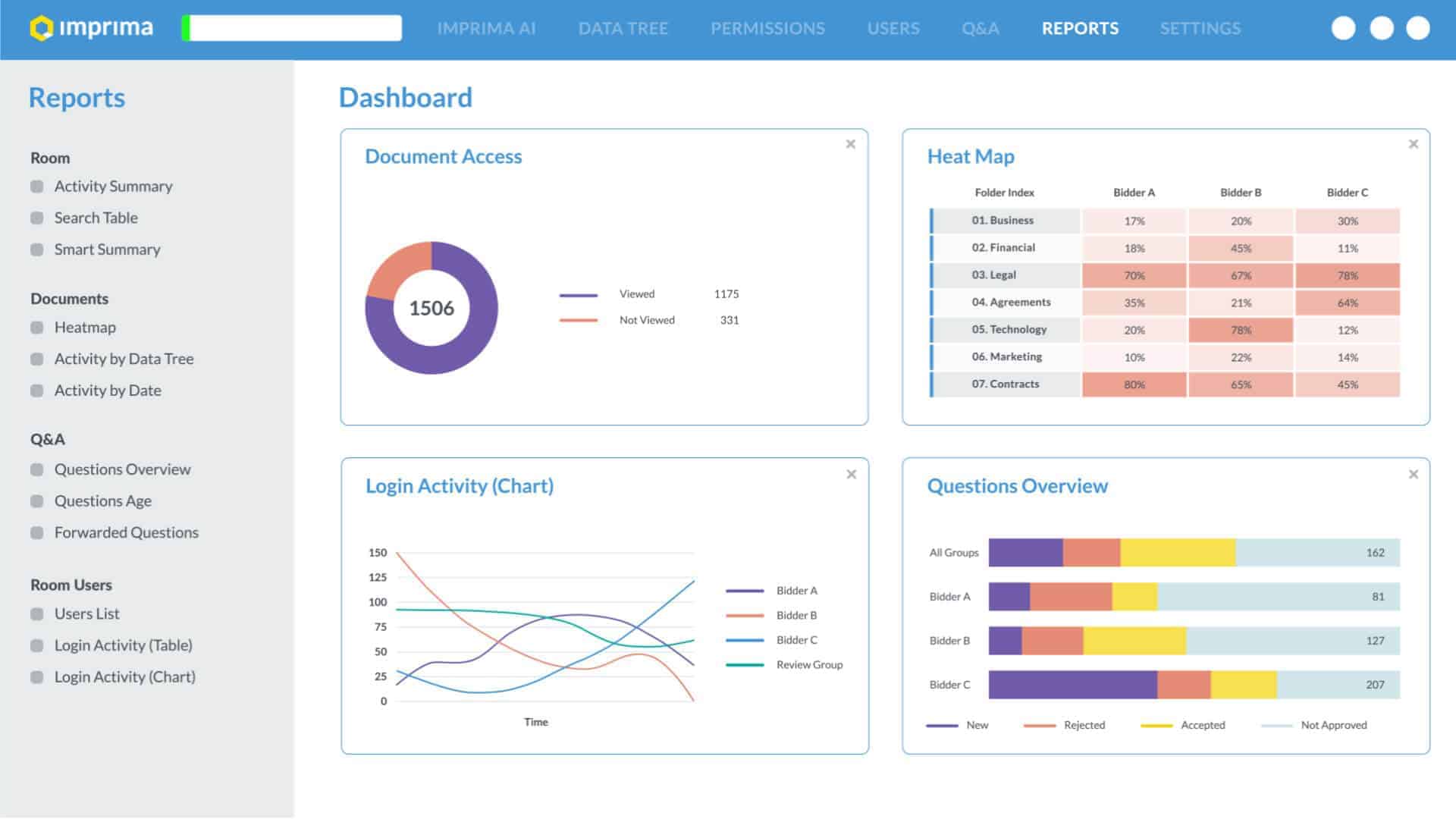 • Today’s M&A teams need the functionality that will generate accurate document and activity reports in real-time – Imprima Virtual Data Rooms for Mergers and Acquisitions provides advanced functionality that generates reports documenting up-to-the-minute user activity.