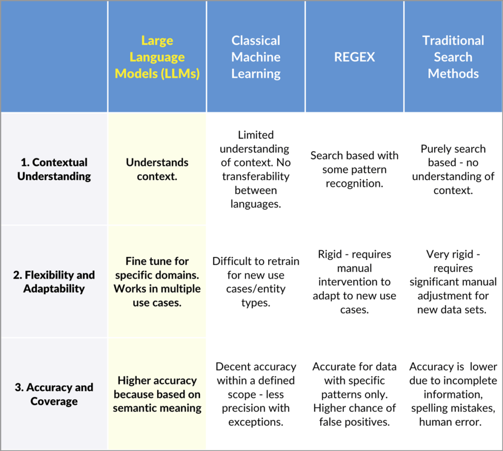 Large Language Models (LLMs) offer some distinct advantages over Classical ML, Regex and traditional search, for redaction.